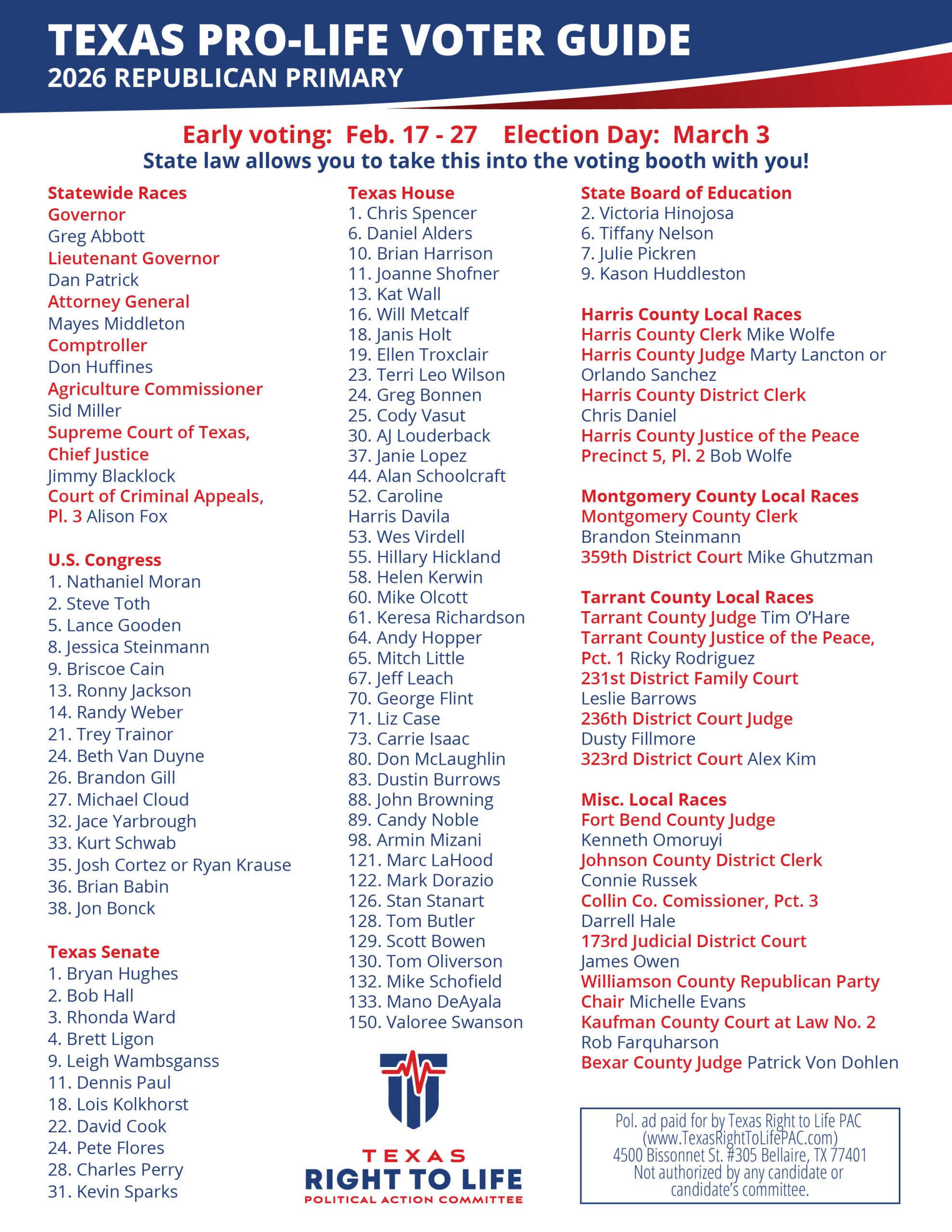 Take the Pro-Life Voter Guide with you to the polls in the 2026 GOP Primary Election!